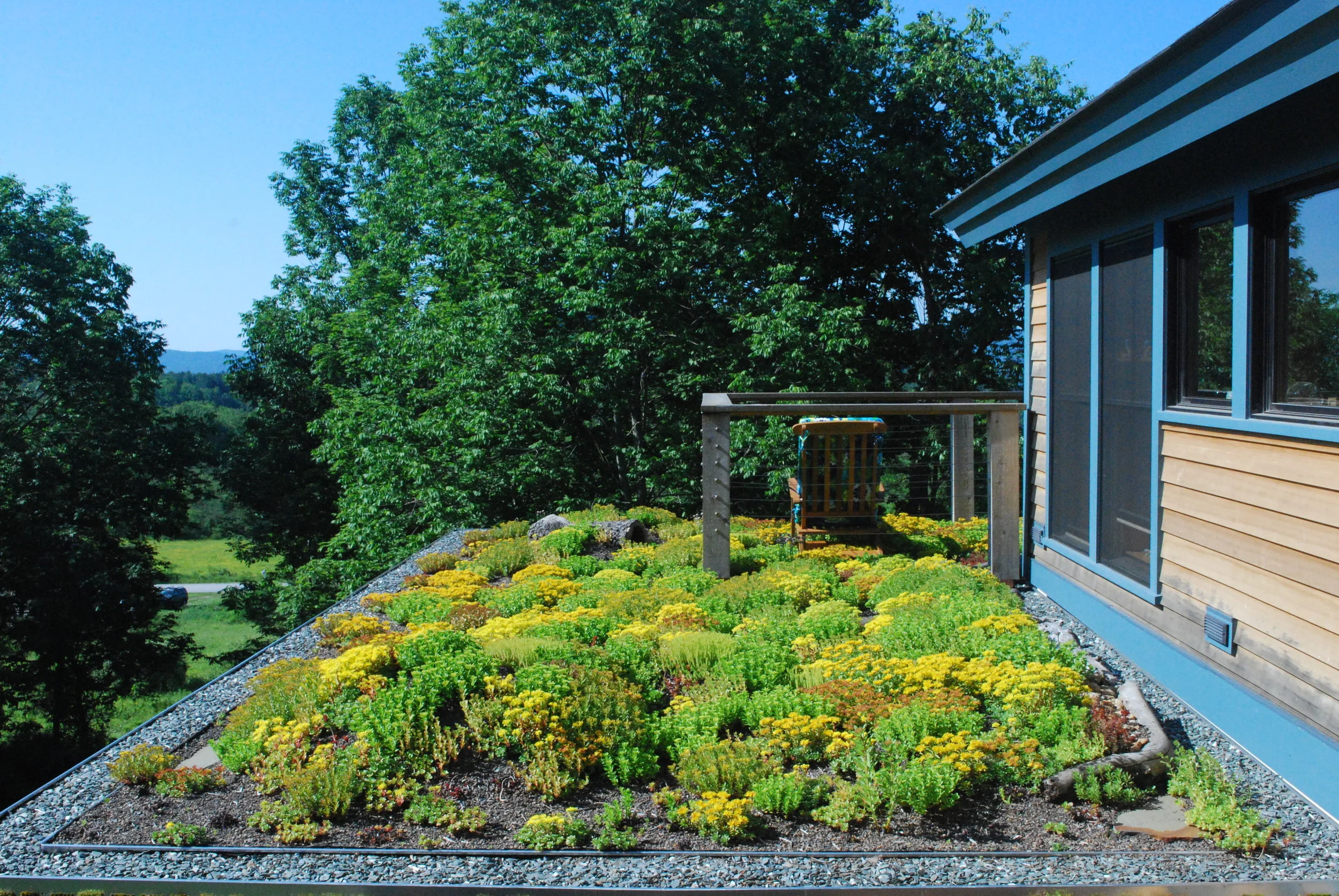 This sunlit sedum balcony overlooks a family-run permaculture homestead in the foothills of southern Vermont and is directly accessible from the residence’s master bedroom. Flagstone stepping stones rest between patches of yellow flowering sedum, and creative natural elements complement the sophisticated rural style of the home.